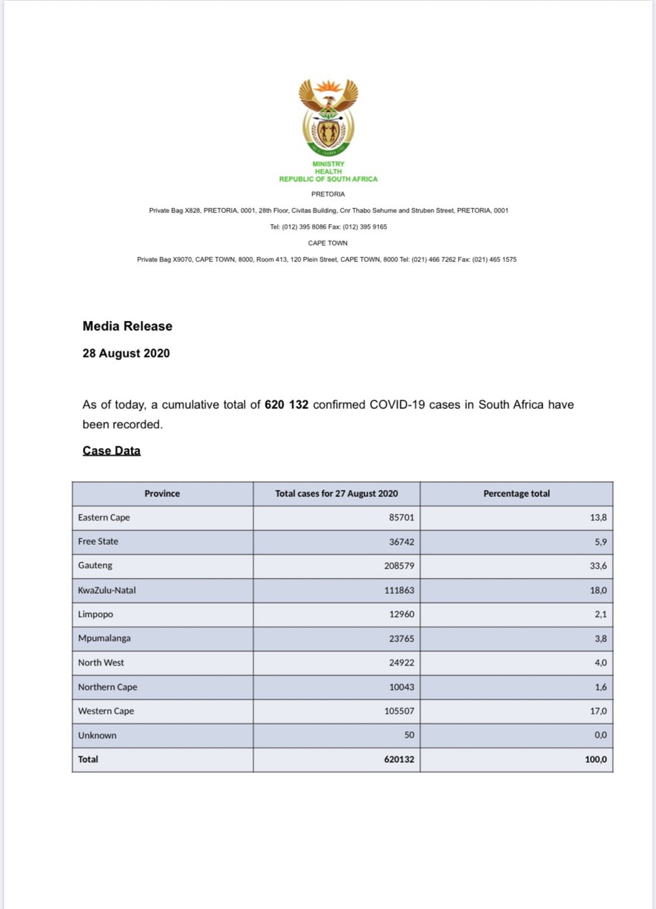 8月28日,南非新冠肺炎确诊人数新增1846例,累计总确诊620132例。新增死亡115例,累计死亡13742例。