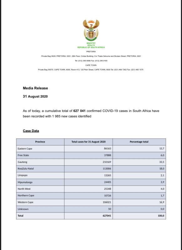 8月31日南非卫生部确认南非当天新增新冠肺炎患者1985人,新冠肺炎患者总人数达到627041人,南非全国已检测3693721人,当日检测18849人。