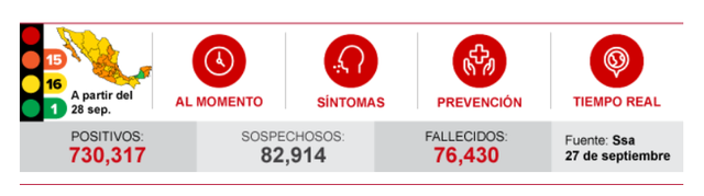 当地时间9月27日,墨西哥卫生部宣布,截止到9月27日晚上7时,墨西哥累计确诊730317新冠肺炎病例,较前一天新增了3886例,墨西哥确诊死亡病例较前一天新增187例,总数已经上升到76430例。