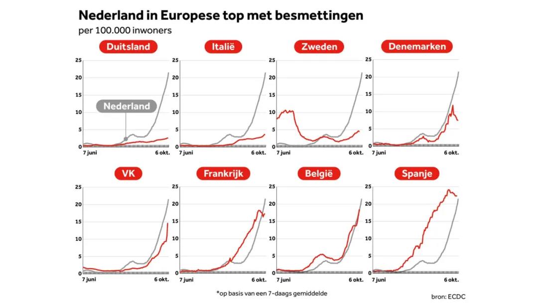 荷兰正迅速成为欧洲最大的感染源。在9月初,荷兰的感染数量与许多周边国家相当,但是目前,荷兰和法国、西班牙一起,几乎在感染率最高的国家中名列前茅。