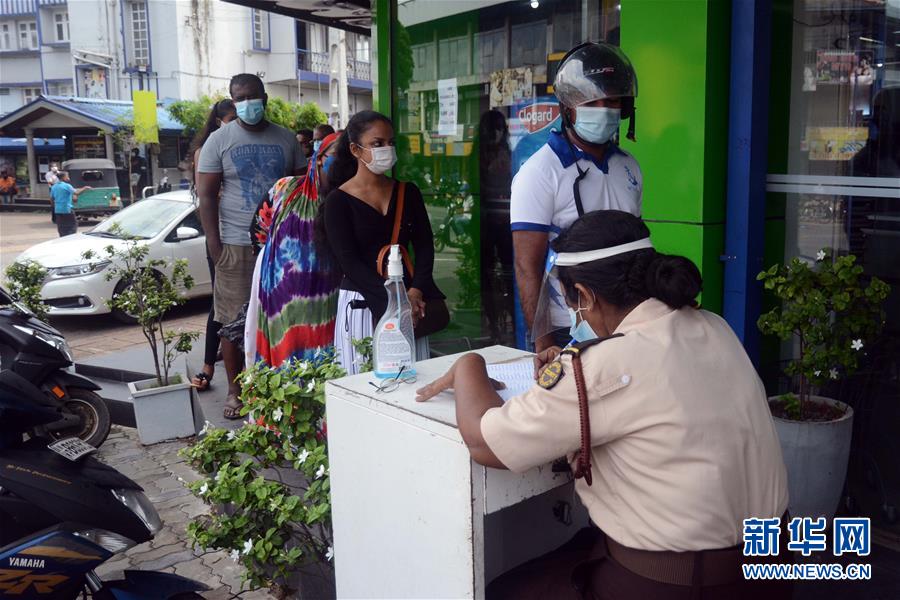 10月16日,在科伦坡市郊的一家市场外,顾客进行身份登记。 斯里兰卡卫生部长万尼亚拉奇15日签署一份特别宪报公告,这份公告把佩戴口罩、保持社交距离和手部卫生等规定上升为法律。 新华社发(加扬·萨米拉 摄)
