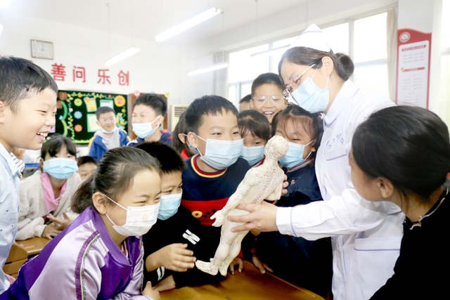 近日,江苏省淮安市中医院工作人员走进淮安市实验小学长征校区四(8)班,为学生讲解穴位、中药知识,并教授防疫知识和经络操,上了一堂精彩的中医药科普课。图为该院护士长卢艳教学生们认识穴位。