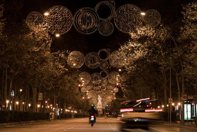 ↑这是10月29日晚在西班牙巴塞罗那拍摄的街道。新华社发(胡安·戈萨摄)
