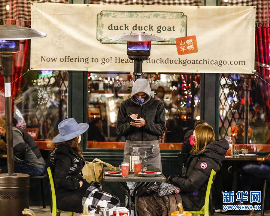 10月30日,在美国伊利诺伊州芝加哥,一名服务员在餐馆室外就餐区为顾客点餐。
