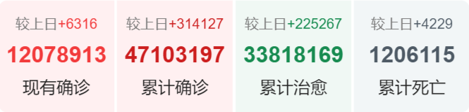 | 国家/地区 | 确诊总数 | 新增确诊 | 死亡总数 |