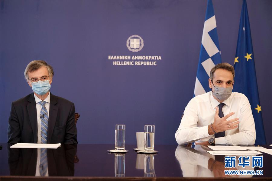 11月5日,希腊总理米佐塔基斯(右)在希腊雅典发表电视讲话。 希腊总理米佐塔基斯5日发表电视讲话,宣布自7日早晨起全国进入为期三周的封锁状态,以防控近期急速蔓延的新冠疫情,避免出现医疗系统“无法承受的”压力。 新华社发(Pool图片,季米特里斯·帕帕米佐斯 摄)