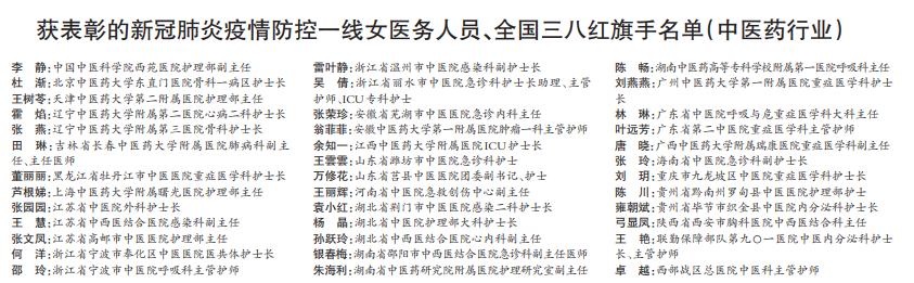 全国妇联、国家卫生健康委、中央军委政治工作部此前联合评选表彰新冠肺炎疫情防控一线女医务人员(集体)、全国三八红旗手(集体),我们聚焦其中中医药人,勾勒一幅杏林巾帼的抗疫群像。
