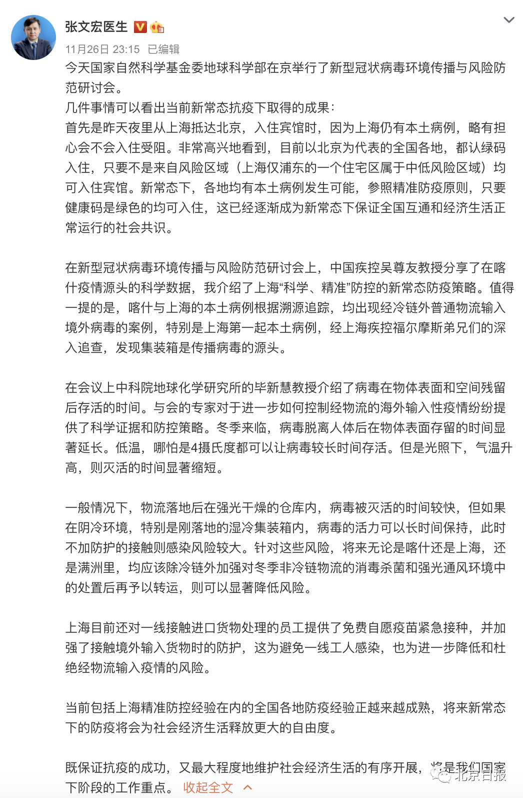 11月26日23时许,@张文宏医生 发微博,谈到针对经物流的海外输入性疫情的防控策略。他主要提及两点: