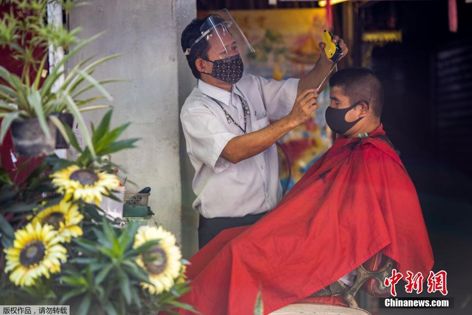 当地时间2021年1月4日,泰国曼谷,一名理发师戴口罩为顾客服务。