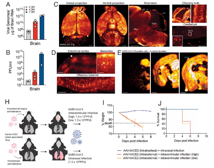 通过AAV-hAEC2直接在大脑中表达ACE2受体并感染新冠病毒,该团队发现,单纯大脑感染就可以诱发小鼠体重降低和死亡,即便其感染剂量只有肺部感染的百分之一(图2H-J)。