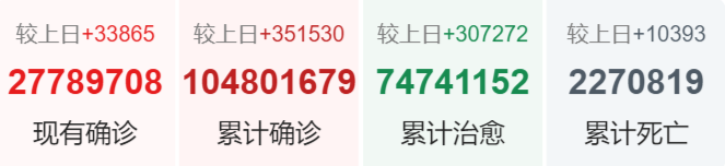 | 美国 | 27,150,457 | 113,459 | 461,930 |