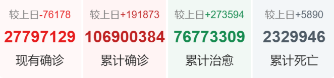 | 美国 | 27,700,629 | 87,031 | 476,405 |