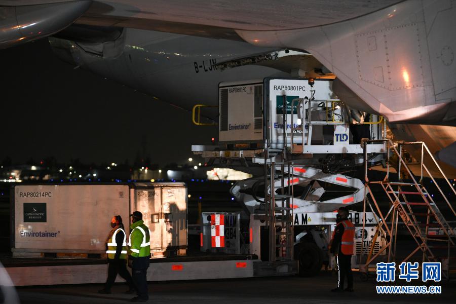 2月27日,在墨西哥首都墨西哥城国际机场,工作人员从飞机上卸下装有中国科兴新冠疫苗的温控集装箱。新华社记者 辛悦卫 摄