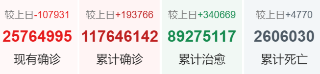 | 美国 | 29,744,652 | 45,116 | 538,628 |