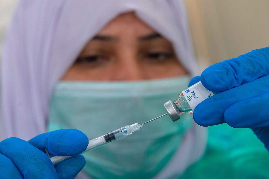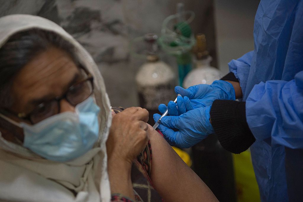 当地时间2021年3月10日,巴基斯坦伊斯兰堡,民众在接种点内接种中国产新冠疫苗。