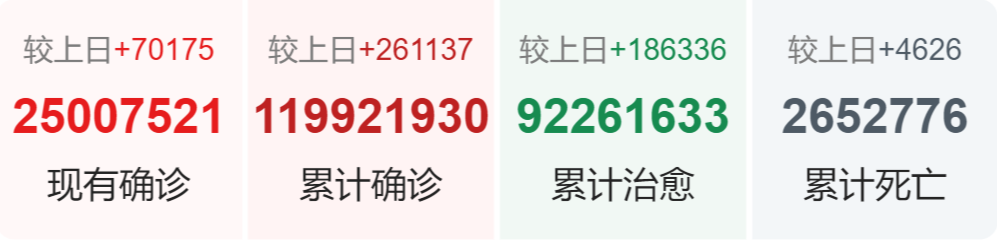 | 国家/地区 | 确诊总数 | 新增确诊 | 死亡总数 |