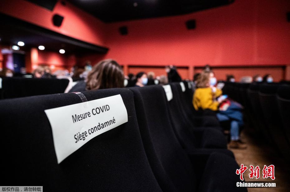 当地时间3月14日,法国巴黎南部Ivry-sur-Seine,民众按照防疫要求佩戴口罩进入电影院,隔位就坐观赏电影。