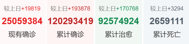 | 国家/地区 | 确诊总数 | 新增确诊 | 死亡总数 |