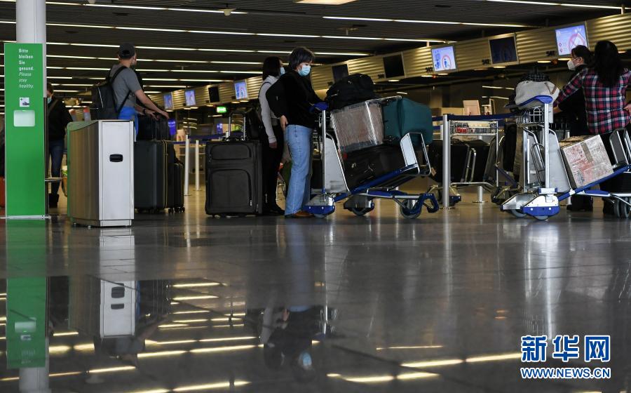 3月18日,在德国法兰克福机场,戴口罩的旅客排队办理登机手续。