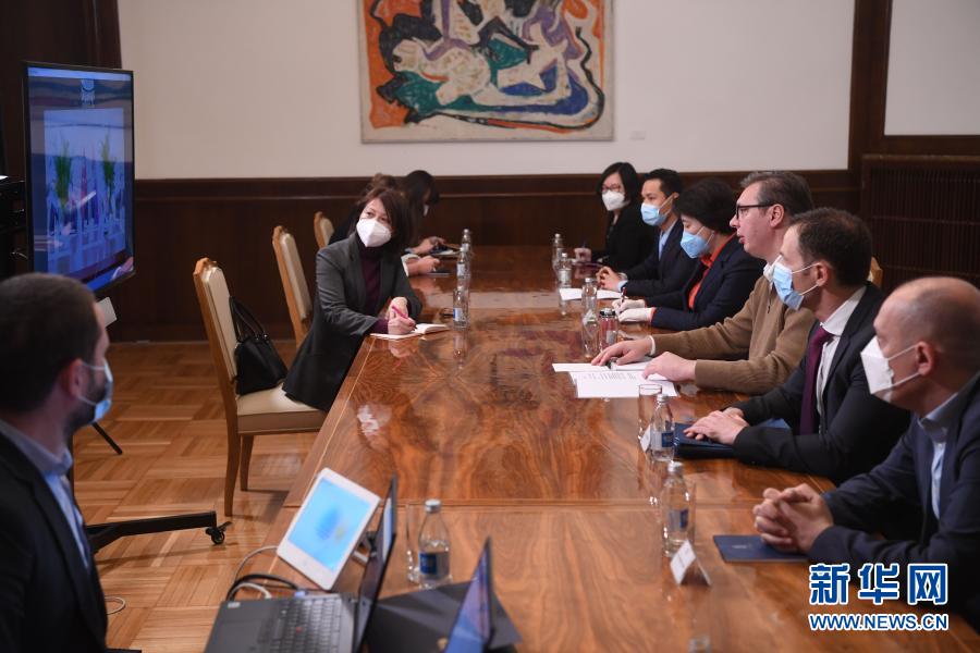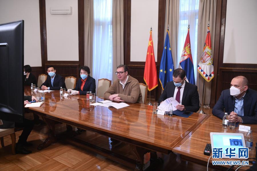 3月18日,塞尔维亚总统武契奇(右三)在首都贝尔格莱德与中国医药集团有限公司(国药集团)举行视频会议。