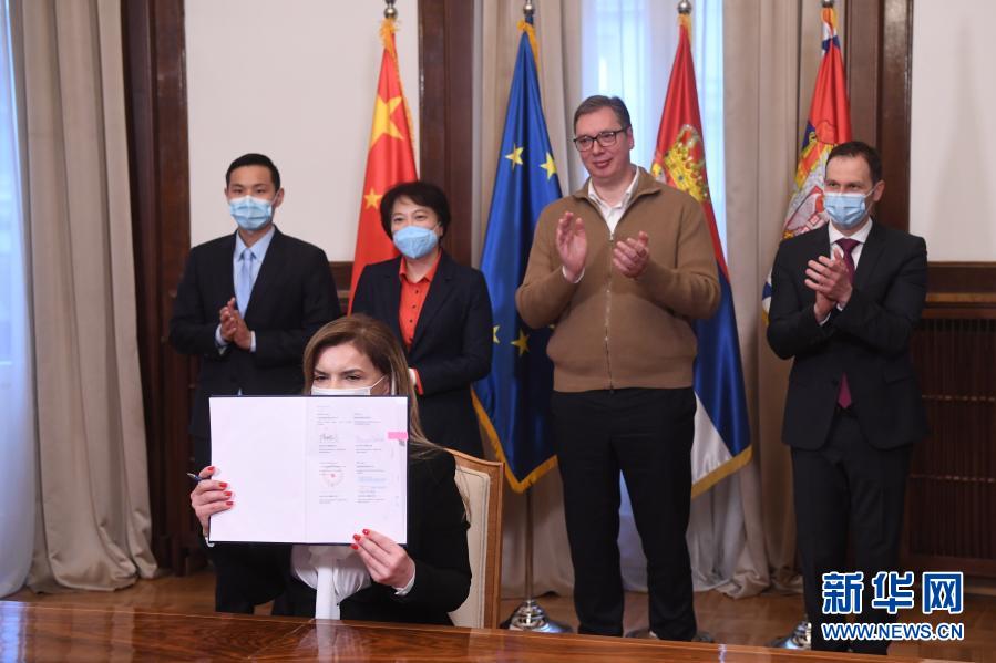 3月18日,塞尔维亚总统武契奇(后右二)与中国驻塞尔维亚大使陈波(后左二)在贝尔格莱德见证塞方通过视频会议的方式与中国医药集团有限公司(国药集团)签署新冠疫苗采购协议。 塞尔维亚总统府18日发布消息,塞方当天通过视频会议的方式与国药集团签署新冠疫苗采购协议。塞尔维亚总统武契奇和中国驻塞尔维亚大使陈波出席会议。 新华社发(塞尔维亚总统办公室供图)