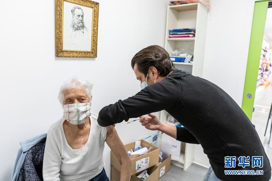 3月19日,在法国北部城市图尔宽,药剂师为一位老人接种阿斯利康新冠疫苗。
