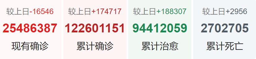据美国约翰•霍普金斯大学数据统计,截至北京时间19日16时25分,美国累计新冠确诊病例29667305例,累计死亡539698例。
