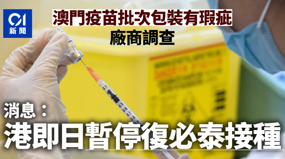 澳門衛生局今日(24日)表示,收到復星實業(香港)公司書面通知,由於近期注意到多個與批號為 210102 的德國BioNTech生產的mRNA新冠疫苗,西林瓶封蓋有關的包裝瑕疵。澳門宣布,即日起暫停接種該疫苗,直至另行通知。據了解,香港今日起亦叫停社區疫苗接種中心的復必泰疫苗接種。