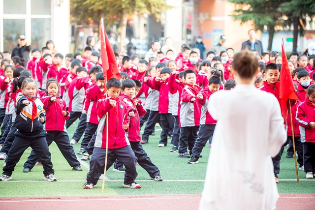 图为医护人员带领学生做八段锦。 通讯员 杨燕/摄