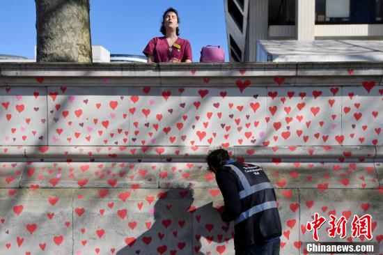 当地时间3月29日,英国伦敦,志愿者和新冠疫情死难者家属在墙上绘制爱心图案,悼念新冠疫情死难者。