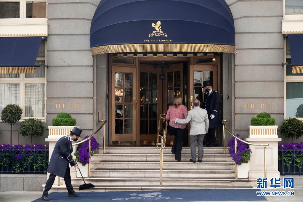 5月17日,工作人员在英国伦敦一家酒店门前迎接顾客。
