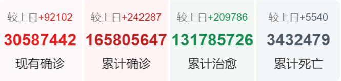 | 美国 | 33,833,181 | 30,214 | 602,616 |