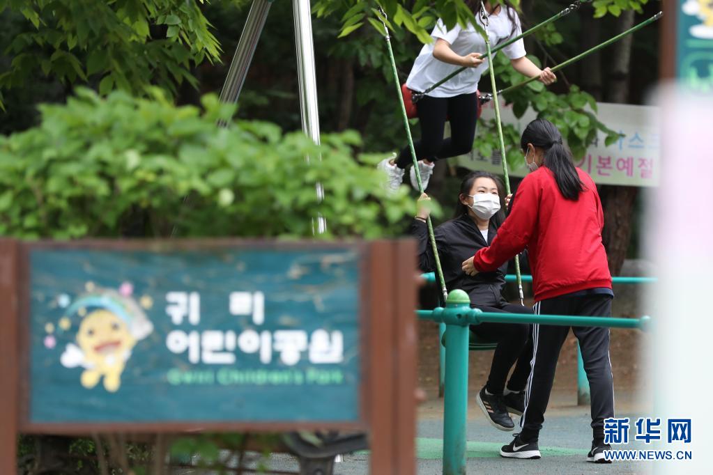 5月21日,戴口罩的青少年在韩国首尔的一个公园荡秋千。 当日,韩国政府宣布将现行的首都圈2级、非首都圈1.5级的防疫响应级别与禁止5人及以上聚集的防疫措施再延长三周至6月13日。新华社记者 王婧嫱 摄