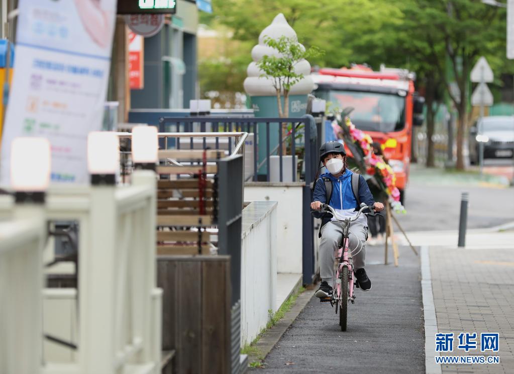 5月21日,戴口罩的男孩在韩国首尔的街道上骑车。