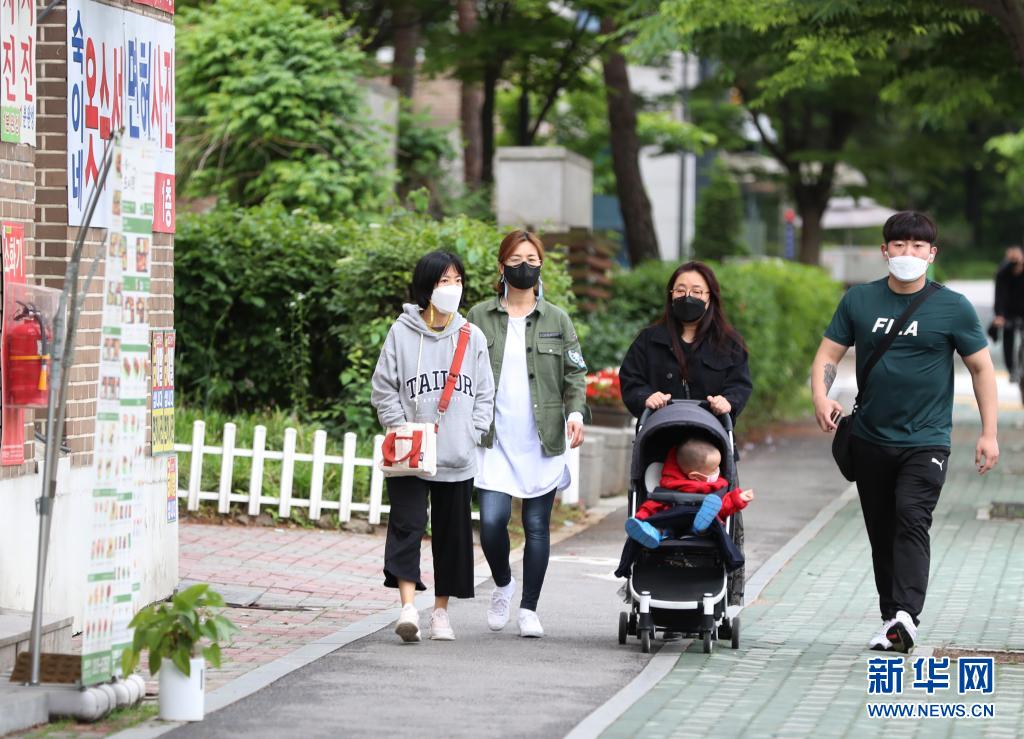 5月21日,戴口罩的市民走在韩国首尔的街道上。
