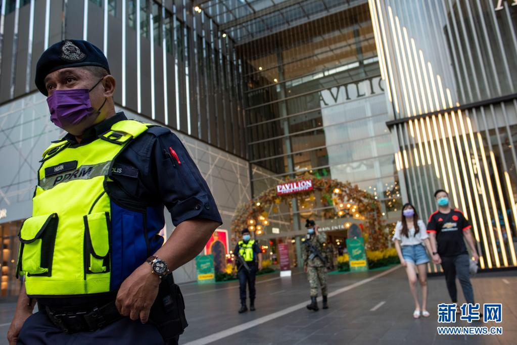5月22日,戴着口罩的警察在马来西亚吉隆坡街头巡逻。