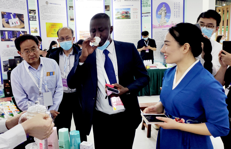 “好喝,好喝!”加纳共和国大使馆公使衔参赞弗朗西斯·奥博库品尝了安徽亳州的黄芪大枣枸杞茶后连声赞许。会展工作人员向他详细介绍了亳州药材的品种以及以道地药材为基础开发出的中成药。弗朗西斯·奥博库连连点头,不时在笔记本记下相关知识。