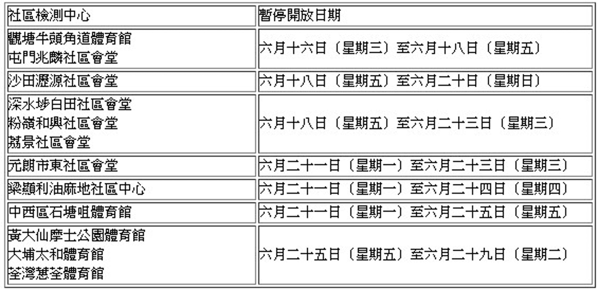 現時全港有21個的社區檢測中心,其中3個即將停止運作。包括位於沙田馬鞍山體育館以及青衣體育館的社區檢測中心將於6月15日(星期三)後停止運作;位於天水圍天晴社區會堂的社區檢測中心將於6月30日(星期三)後停止運作。
