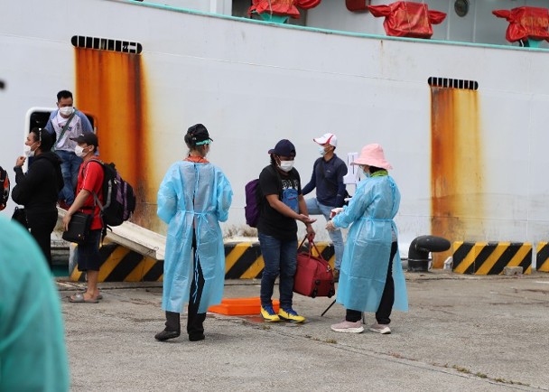 台灣的遠洋魷釣船結束在海外的作業後,紛紛返抵高雄前鎮漁港,周二(15日)有6艘遠洋漁船,近300名漁工返抵港口。高雄市政府要求返回的漁船依防疫統一作業程序及標準,就算全程無海上接觸史,但回到前鎮漁港後仍一律全船篩檢,因此漁工下船上岸時要立即接受消毒及檢測,再由防疫巴士載往檢疫酒店入住檢疫。