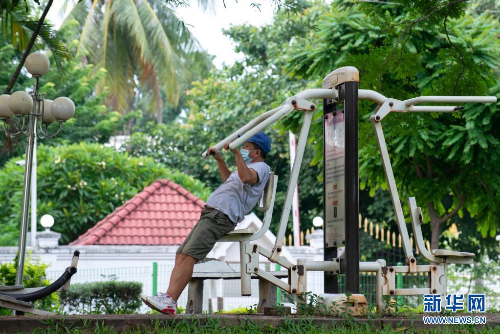 7月5日,一名市民在老挝万象一处公园内戴着口罩锻炼。 鉴于新冠疫情从邻国输入的风险升高,老挝政府4日宣布再次延长疫情防控期15天至7月19日。 新华社发(凯乔摄)