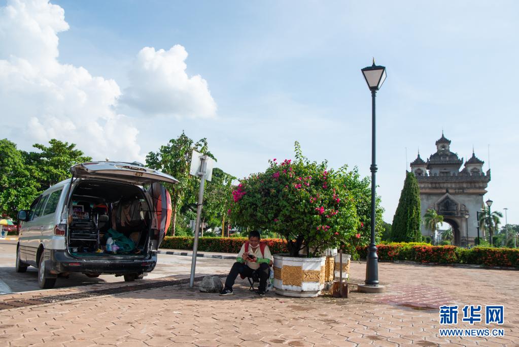 7月5日,一名摄影师在老挝万象的凯旋门公园等待游客。
