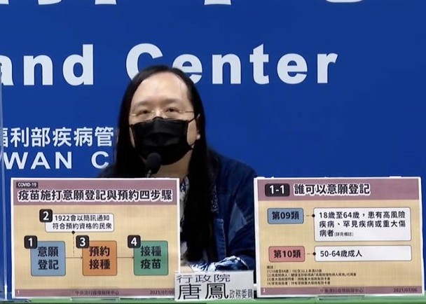 台灣推出疫苗預約平台。圖為行政院政務委員唐鳳。