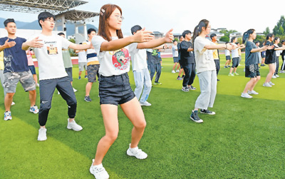 图为福建中医药大学的学生在练习该校编制的太极健肺养心功,以达到强身健体、预防疾病的功效。新华社记者 宋为伟摄