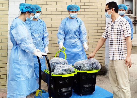 图为当阳市中医医院医务人员配送中药预防汤剂至集中医学观察点。明艳/摄
