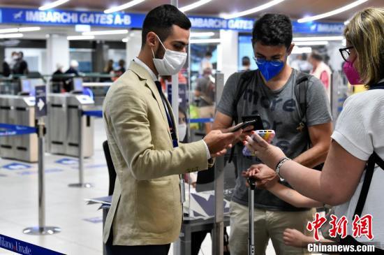 当地时间2021年9月1日,意大利米兰,工作人员在机场检查乘客的绿色通行证。