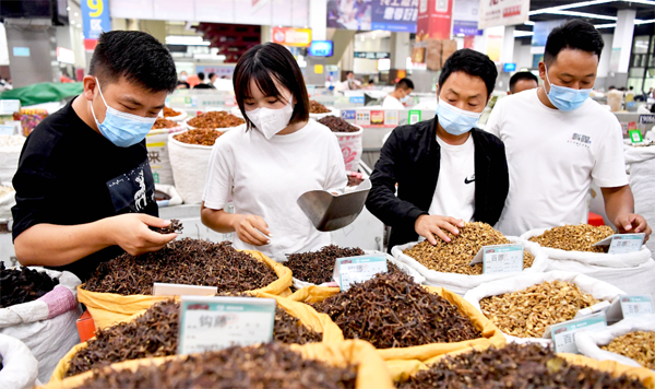 图为客商在交易会上选购中药材。刘勤利/摄