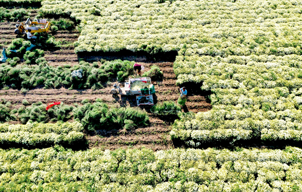 安徽省亳州市谯城区的农民在田间采收菊花