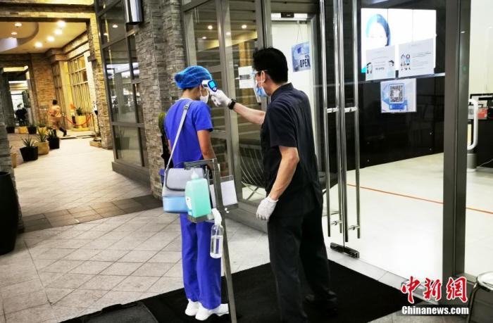 资料图:菲律宾马尼拉某牙医专科诊所护士戴着口罩、面罩,身着防护服,进入诊所前检测体温并进行手部消毒。中新社记者 关向东 摄