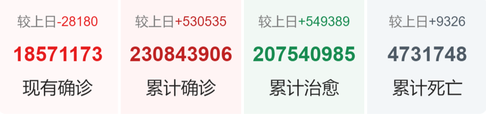 | 国家/地区 | 确诊总数 | 新增确诊 | 死亡总数 |