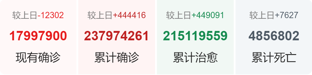 | 国家/地区 | 确诊总数 | 新增确诊 | 死亡总数 |